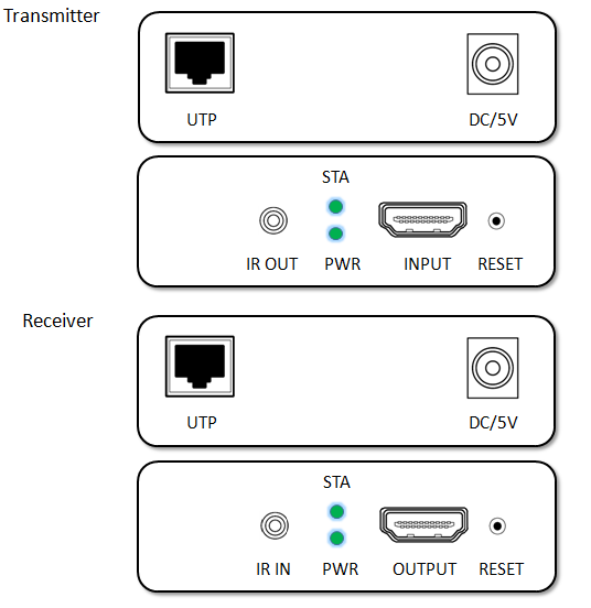 Port name Description INPUT/OUTPUT HDMI signal input/output IR IN/OUT IR signal input/output UTP RJ45 port connect cat5e/6 cable. DC 5V Power adapter socket RESET Press for 5 second to restore system setting to factory default LED indicator Description STA Video signal connection indicator PWR System power indicator